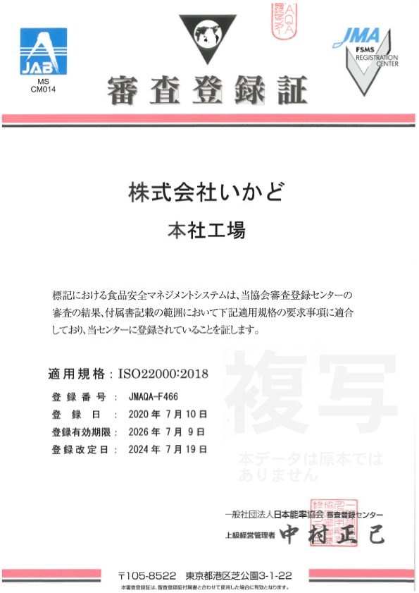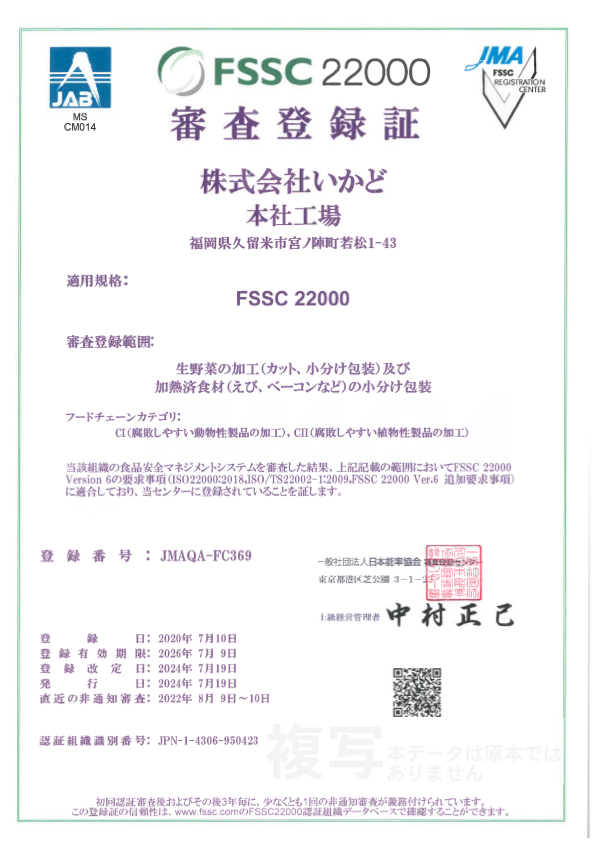 株式会社いかどでは、食品安全システム認証の国際規格であるFSSC22000の認証を受けております。