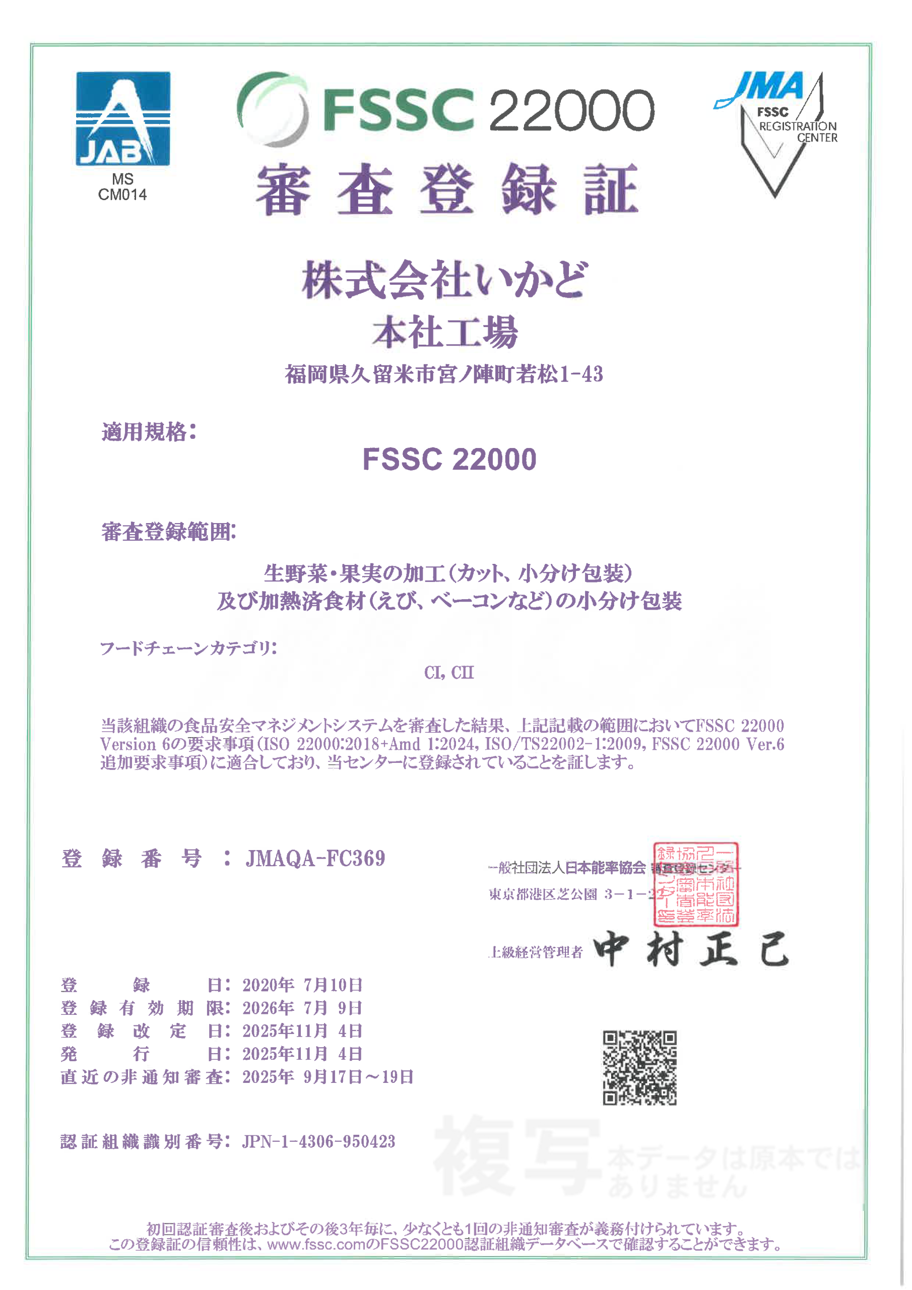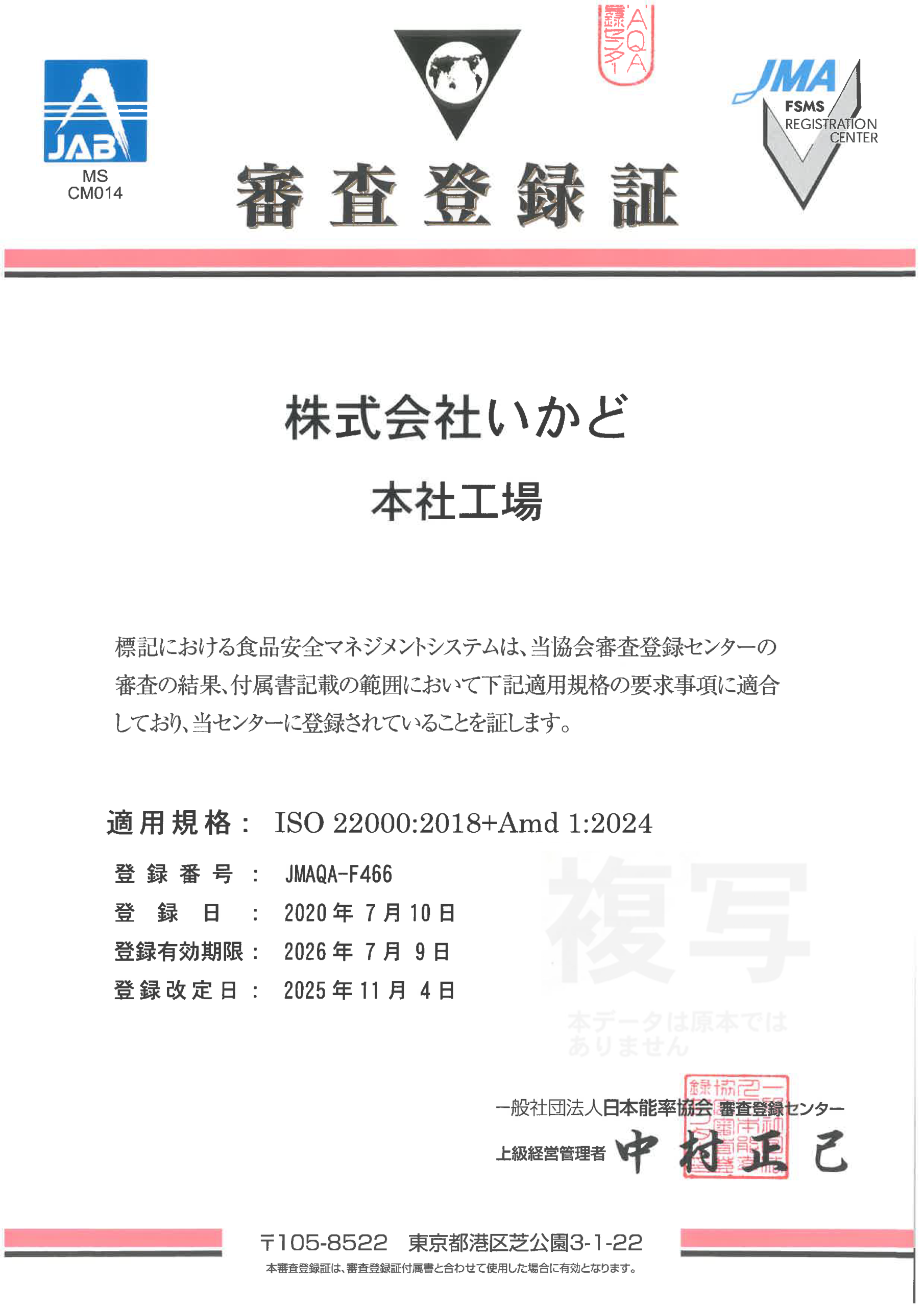 株式会社いかどでは、食品安全システム認証の国際規格であるFSSC22000の認証を受けております。